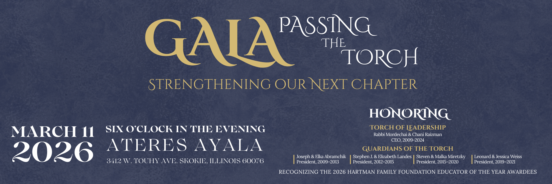 InstagramThis field is for validation purposes and should be left unchanged.I am a(Required) Teacher at an ATT School Community Member Corporate Sponsor ATT School(Required) Akiba-Schechter Jewish Day School Arie Crown Hebrew Day School Bais Yaakov High School of Chicago Fasman Yeshiva High School Hanna Sacks Bais Yaakov Hillel Torah North Suburban Day School Ida Crown Jewish Academy Joan Dachs Bais Yaakov Lubavitch Girls High School Philip and Rebecca Esformes Cheder Lubavitch Girls School REACH Seymour J. Abrams Cheder Lubavitch Hebrew Day School Yeshiva Ohr Boruch/The Veitzener Cheder Yeshivas Tiferes Tzvi Name(Required) First Last Email(Required) Address(Required) Street Address Address Line 2 City AlabamaAlaskaAmerican SamoaArizonaArkansasCaliforniaColoradoConnecticutDelawareDistrict of ColumbiaFloridaGeorgiaGuamHawaiiIdahoIllinoisIndianaIowaKansasKentuckyLouisianaMaineMarylandMassachusettsMichiganMinnesotaMississippiMissouriMontanaNebraskaNevadaNew HampshireNew JerseyNew MexicoNew YorkNorth CarolinaNorth DakotaNorthern Mariana IslandsOhioOklahomaOregonPennsylvaniaPuerto RicoRhode IslandSouth CarolinaSouth DakotaTennesseeTexasUtahU.S. Virgin IslandsVermontVirginiaWashingtonWest VirginiaWisconsinWyomingArmed Forces AmericasArmed Forces EuropeArmed Forces Pacific State ZIP Code Company Name(Required)Logo ImageAccepted file types: jpg, jpeg, png, gif, Max. file size: 5 MB. Teacher DetailsWill you attend?(Required) Yes No Would you prefer(Required) Mixed seating Separate seating Will your spouse be attending with you?(Required) Yes (+$54) No Spouse's Full Name(Required)Celebrate our honorees and Educators of the Year with a featured ad1/4 page ad ($36)1/2 page ad ($54)Full page ad ($72)Full page Silver ad ($100)Full page Gold ad ($180)Full page Platinum ad ($250)Reduced rates for educatorsYou can enter your ad text below, including any names, dedications, or messages – or you can upload a document containing your ad text using the following upload form. Double-check spelling and punctuation, as what you submit will appear as entered. If you would like ATT to create the ad for you, please contact us.Ad TextFor 1/4 page ad please limit to 75 words, 1/2 page ad limit is 125 words, full page ad limit is 200 words.-or- Upload Ad Text FileAccepted file types: doc, docx, pdf, Max. file size: 10 MB. Community Member DetailsWill you attend?(Required) Yes No Would you prefer(Required) Mixed seating Separate seating Attendee Options(Required)1 Attendees + 1/4 page ad ($180)2 Attendees + 1/4 page ad ($360)2 Attendees + 1/2 page ad ($540)2 Attendees + full page ad ($720)2 Attendees + full page Silver ad ($1000)2 Attendees + full page Gold ad ($1800)2 Attendees + Platinum ad ($2500)Full Table + Platinum ad ($3600)Celebrate our honorees and Educators of the Year with a featured ad(Required)1/4 page ad ($360)1/2 page ad ($540)Full page ad ($720)Full page Silver ad ($1000)Full page Gold ad ($1800)Full page Platinum ad ($2500)Attendees(Required)Please list the full name of each attendee included in your selection above. The Full Table option includes 10 seats.You can enter your ad text below, including any names, dedications, or messages – or you can upload a document containing your ad text using the following upload form. Double-check spelling and punctuation, as what you submit will appear as entered. If you would like ATT to create the ad for you, please contact us.Ad TextFor 1/4 page ad please limit to 75 words, 1/2 page ad limit is 125 words, full page ad limit is 200 words.-or- Upload Ad Text FileAccepted file types: doc, docx, pdf, Max. file size: 10 MB. Corporate Sponsorship DetailsClick here to see the corporate sponsorship tiersCorporate Partnership Options(Required)$3,600 – Bronze Sponsorship$5,400 – Silver Sponsorship$7,200 – Gold Sponsorship$10,000 – Platinum Sponsorship$18,000 – Teacher Gift Underwriter$25,000 – Dinner UnderwriterYou can enter your ad text below, including any names, dedications, or messages – or you can upload a document containing your ad text using the following upload form. Double-check spelling and punctuation, as what you submit will appear as entered. If you would like ATT to create the ad for you, please contact us.Ad TextFor 1/4 page ad please limit to 75 words, 1/2 page ad limit is 125 words, full page ad limit is 200 words.-or- Upload Ad Text FileAccepted file types: doc, docx, pdf, Max. file size: 10 MB. Will you attend?(Required) Yes No Would you prefer(Required) Mixed seating Separate seating Attendees(Required)Please list the full name of each attendee included in your selection above. The Full Table option includes 10 seats.Additional SeatsPurchase Additional Seats$180 / seatAdditional Seats CostAdditional Seat 1(Required)Additional Seat 2(Required)Additional Seat 3(Required)Additional Seat 4(Required)Additional Seat 5(Required)Additional Seat 6(Required)Additional Seat 7(Required)Additional Seat 8(Required)Additional Seat 9(Required)Additional Seat Names(Required)Additional Donation OptionsWould you like to make an additional donation? Yes No Custom Donation Amount(Required) Billing InformationCredit Card Total Δ